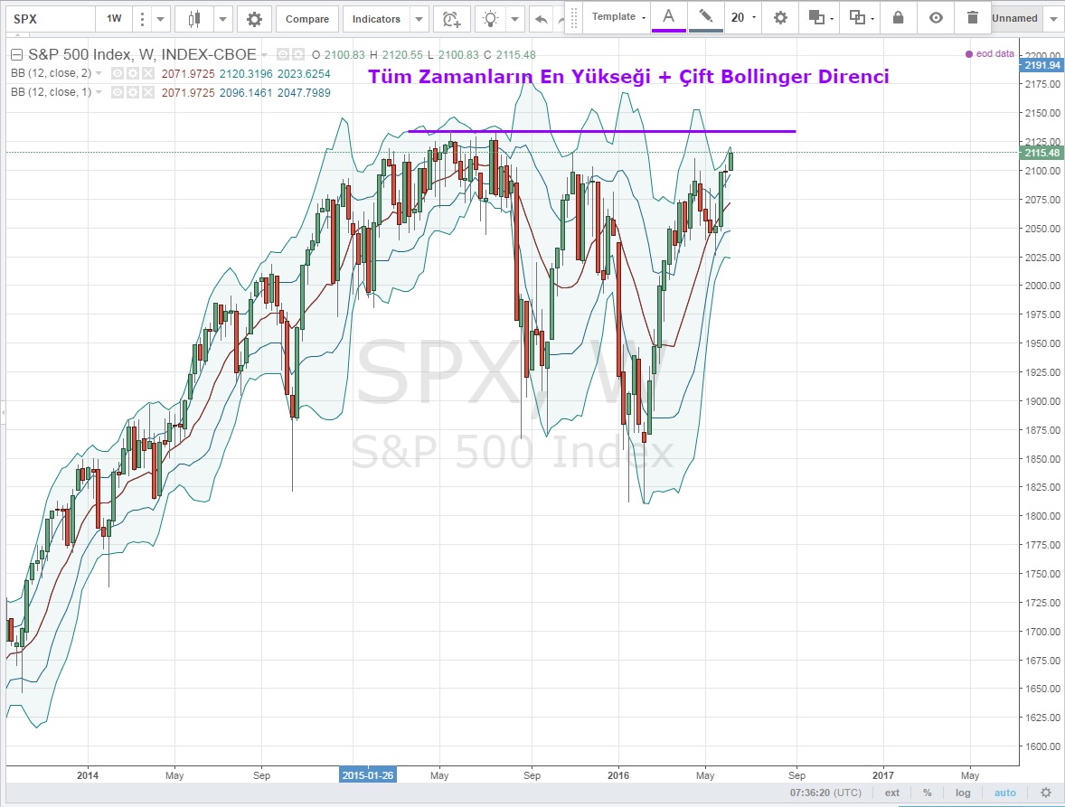 Haftalık grafiklerde Çift Bollinger+ Tarihi Zirve Direncine dayanan endeks