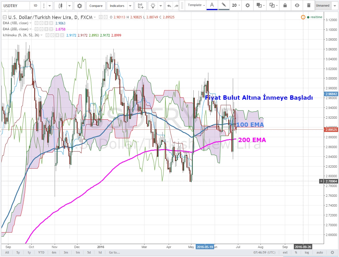 Yine günlük grafiklerde Ichi Moku bulutu altında inmeye çalışan paritede düşüş bir süre daha devam edebilir