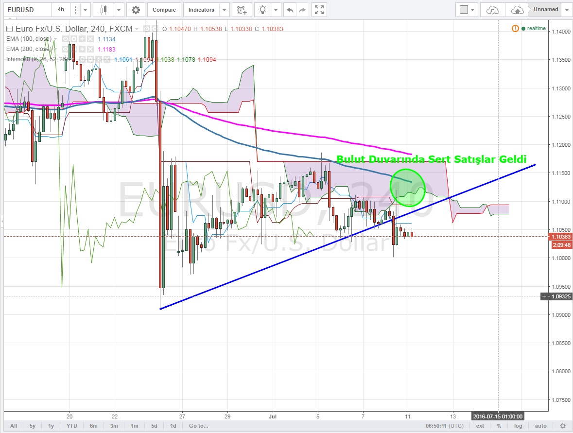 Daha kısa vadede TDİ verisi sonrası klasik stop çalıştırma hareketleri gözlemlenen parite Ichi Moku bulut duvarında sert satışlar ile karşılaşarak düşüşe devam etti