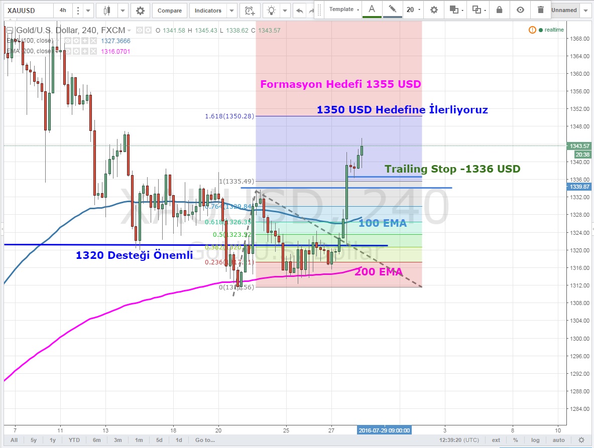 Sırası ile 1350 ve 1355 USD hedeflerini beklemek isteyenler trailing stop seviyelerini 1336 USD 'ye çekerek pozisyon karının bir kısmını sabitleyebilir