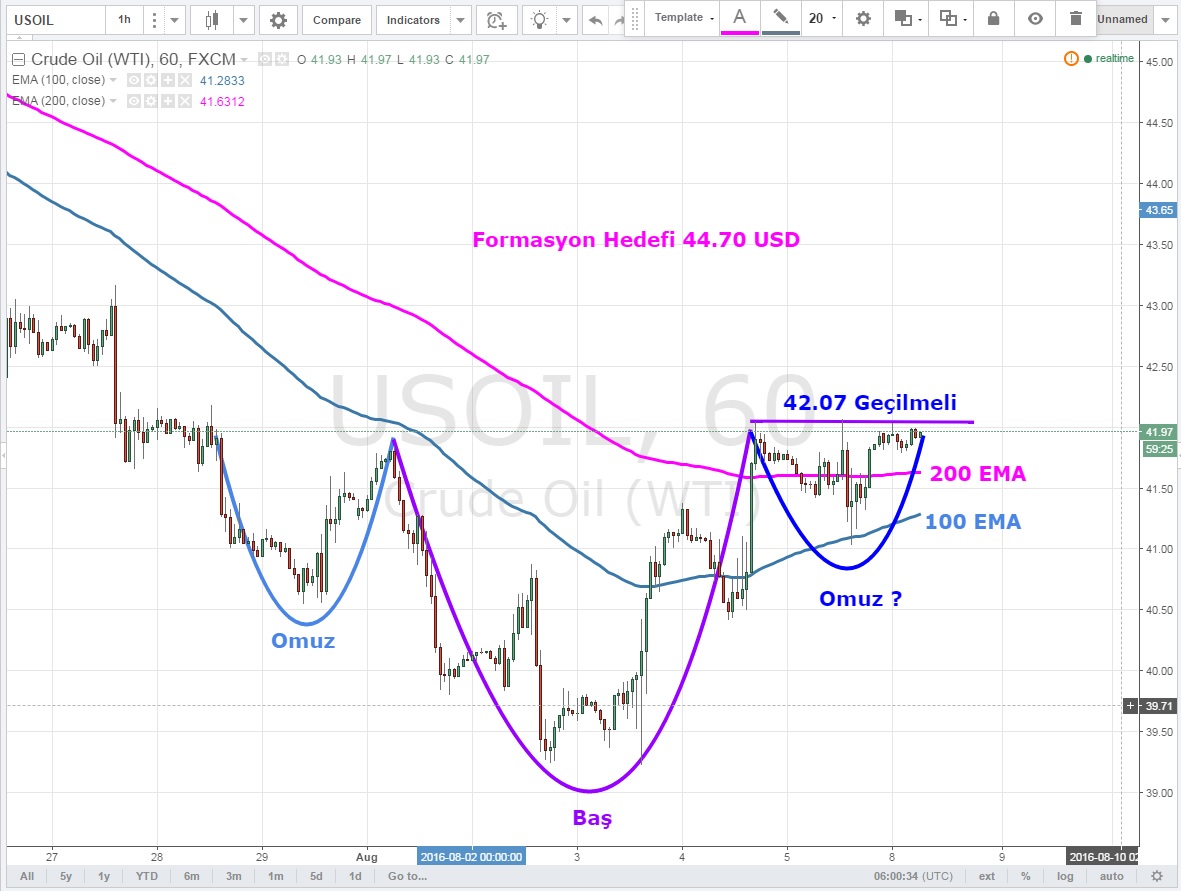 Saatlik grafikelrde ters omuz baş omuz formasonu oluşturmaya başlayan WTI 'da 42.07 USD seviyesi geçilince formasyon tetiklenir ve sırası ile