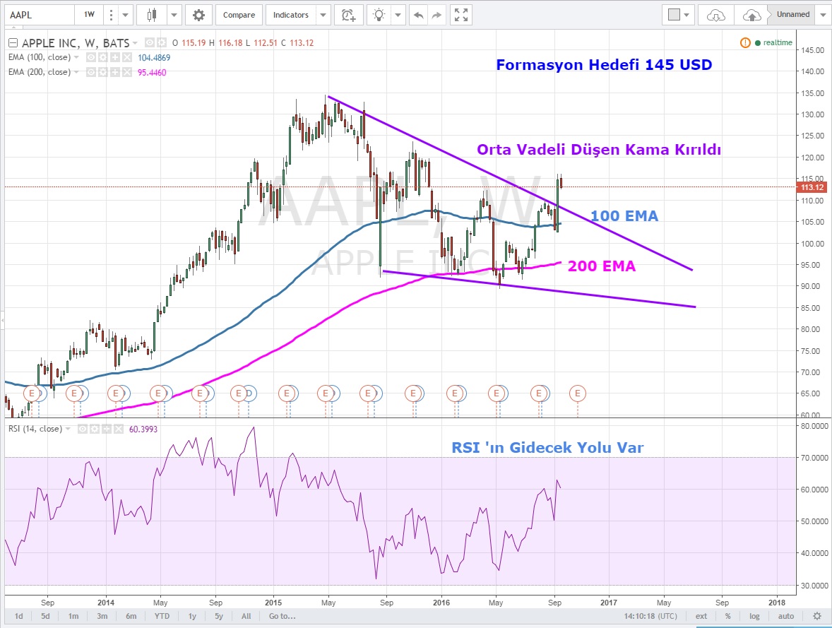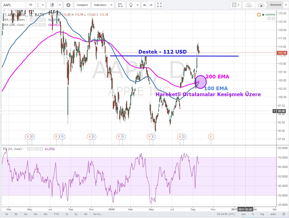 Amerikan endekslerinde 2 hafta önce yaşanan sert düşüşe rağmen ayakta kalmayı başarabillen ve endeksin geçtiğimiz hafta yükselmesi ile yeni çıkaracağı iphone 7 serisinin rüzgarını da arkasına alan Apple 'a teknik olarak baktığımızda
