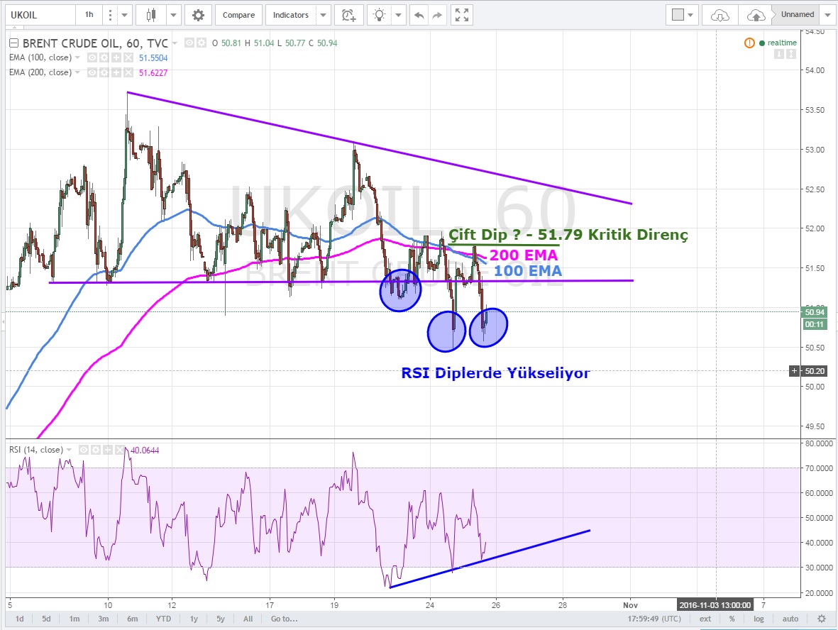 Saatlik grafiklerde ise çift dip oluşturmaya çalışan ve dün gördüğü en düşük olan 50.49 USD seviyesini henüz test etmeden daha yukarıda kısa vadeli yeni dibini oluşturan Brent 'in 51.79 USD 'yi geçerse teknik olarak 120 cent 'lik bir yükseliş potansiyeli bulunuyor