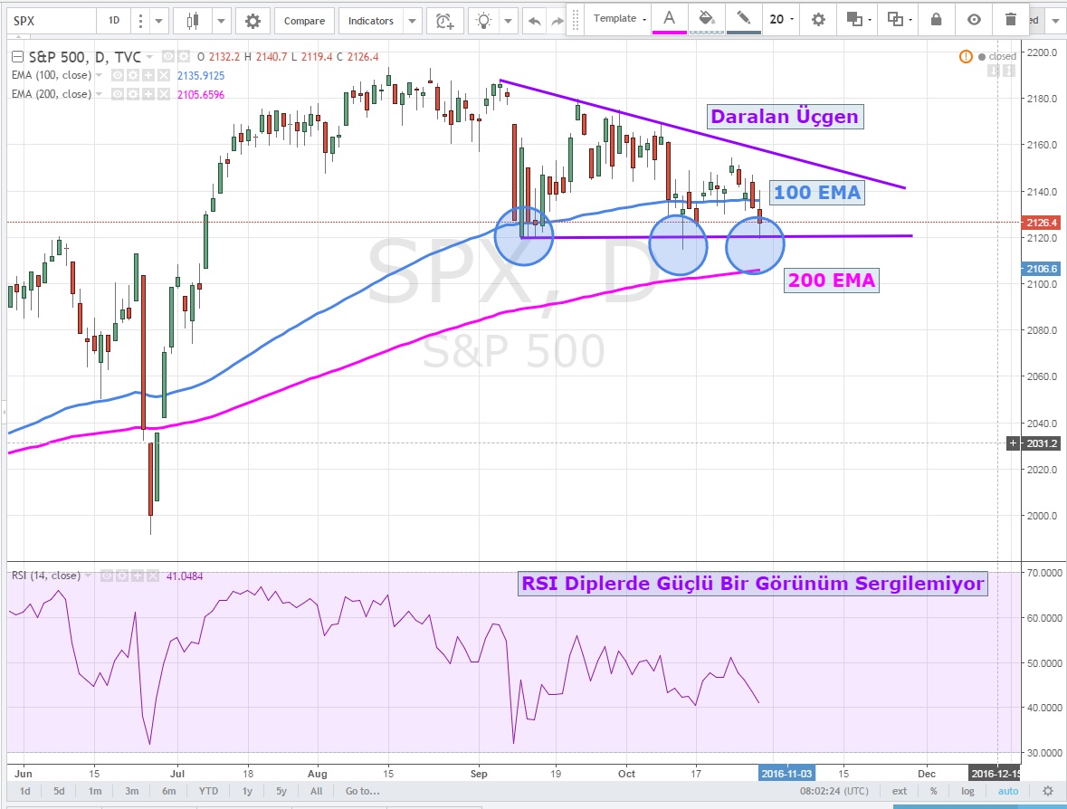 Günlük grafiklerde indiğimizde daralan üçgen görüntüsü var ve 3 'lü dipte RSI herhangi bir uyumsuzluk göstermiyor .Bu durumda 2128 desteğinin önemi yine ortaya çıkıyor
