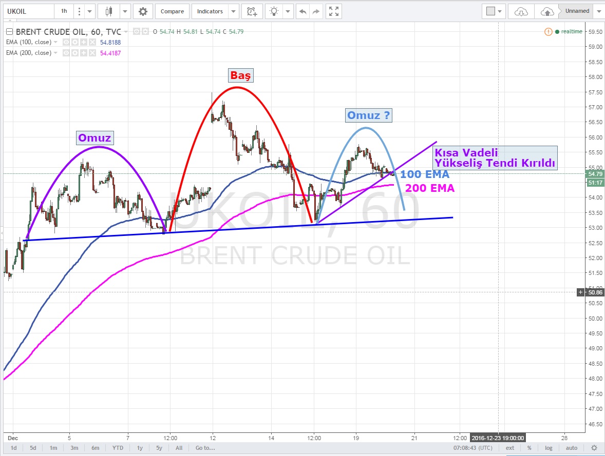 Kısa vadeli grafiklerde ki sağ omuz trend çizgisi daha sonra ise 53 USD kırıldığında formasyon tetiklenecektir