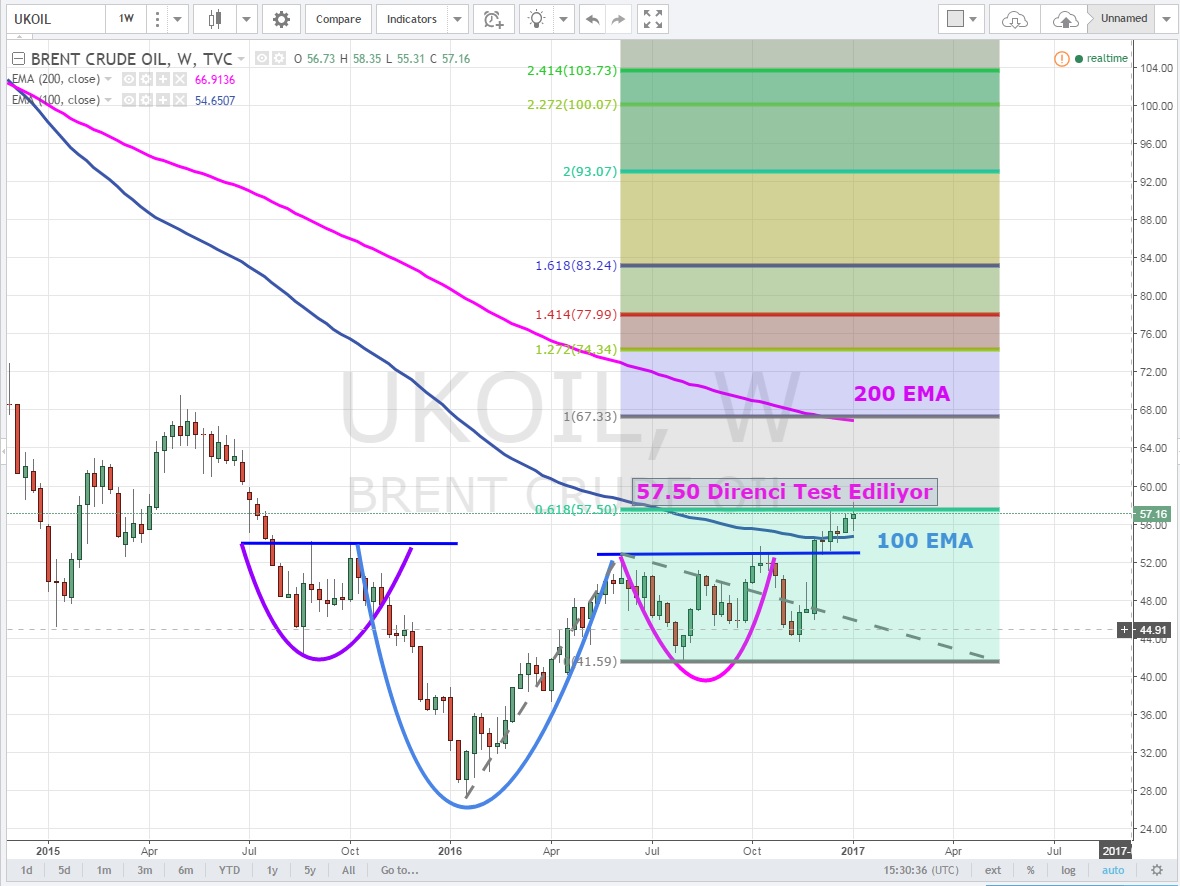 Haftalık grafiklerde ki devasa TOBO hedefi mevcut seviyelerden çok daha yukarılarda .İlk ara direnç olan 57.50 direnci ufak bir aranın ardından tekrar test ediliyor
