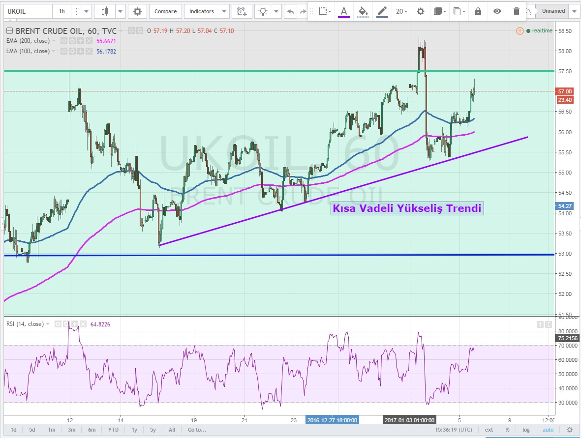 Kısa vadeli grafiklere indiğimizde ise yükseliş trendi oluşturan siyah inci veri ile birlikte 57.50 'yi kırarsa ilk hedef 58.20 zirvesi olacaktır