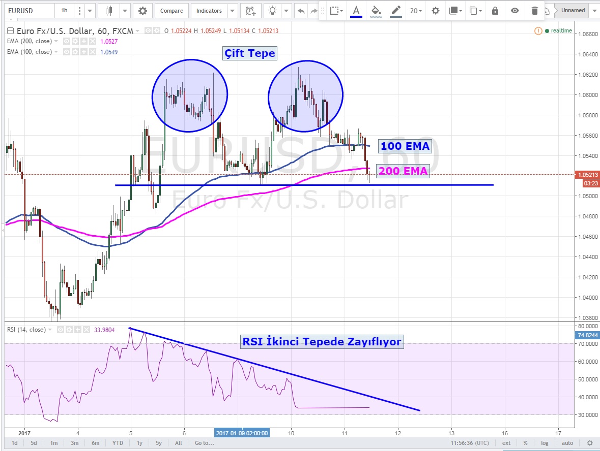 Daha kısa vadede ise çift tepe oluşturan paritede ikinci tepede RSI 'ın zayıflaması dikkat çekmekte