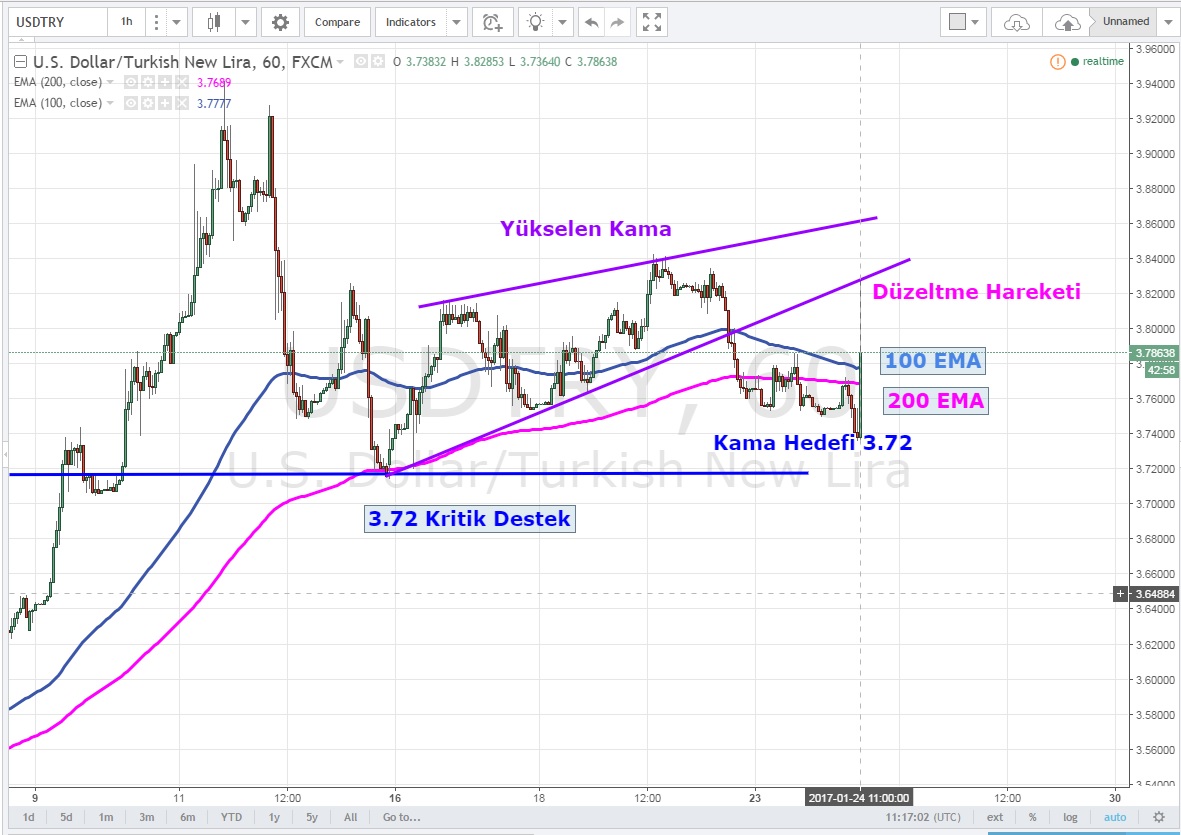 Kısa vadede ise yükselene kamayı kıran (formasyon hedefi 3.72 ) kama tabanına doğru düzeltme yaptıktan sonra geri çekilmeye başladı