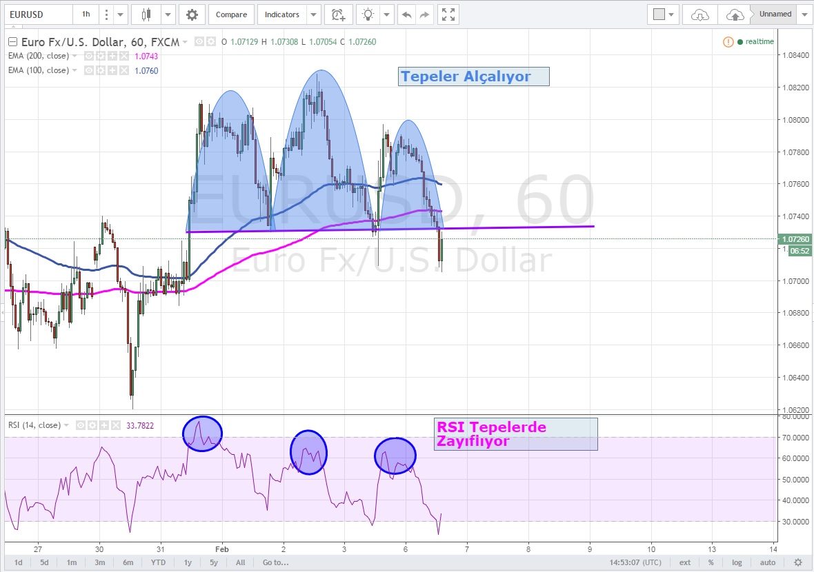 Saatlik grafiklerde 3 'lü tepe yapan EURUSD 'de RSI tepelerde giderek zayıflıyor