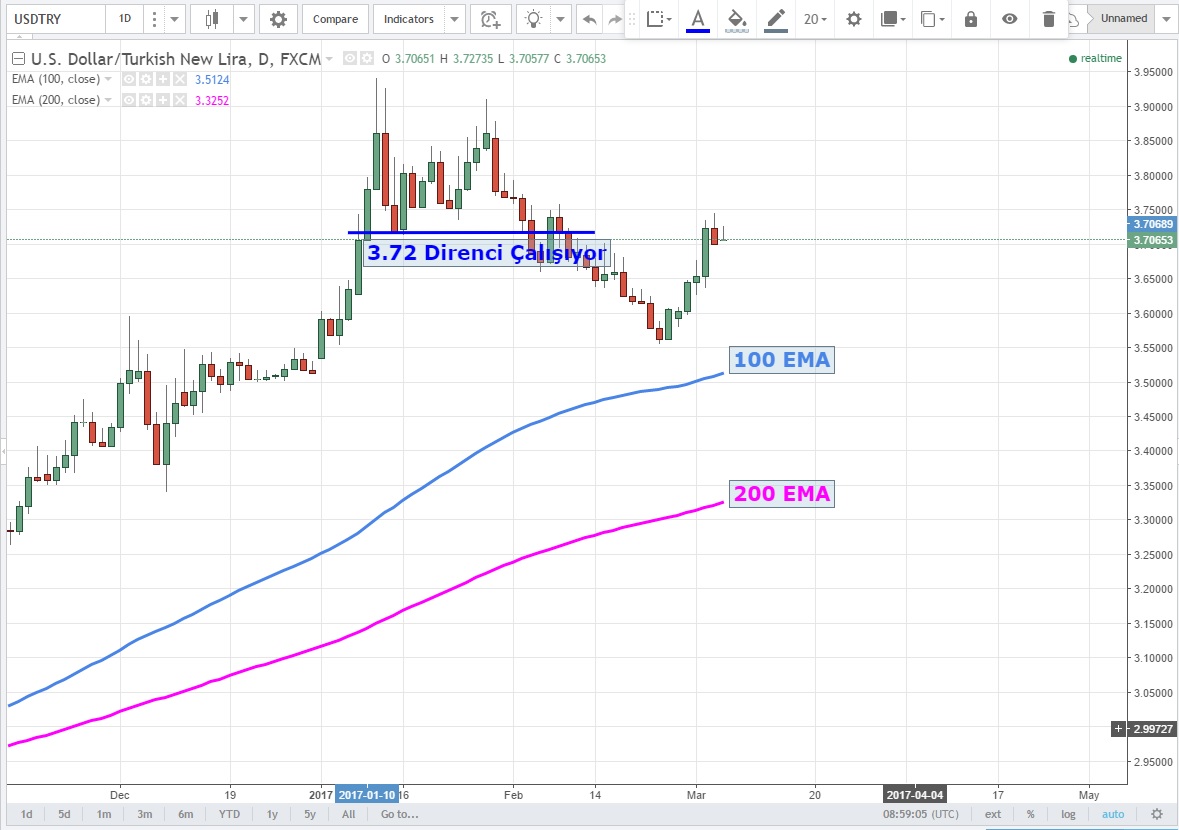 Günlük grafiklerde 3.72 altına inmeye başlayan paritede burası geçilmediği sürece oyuna yeni satıcılar gelecek ve TRY güçlü kalabilir