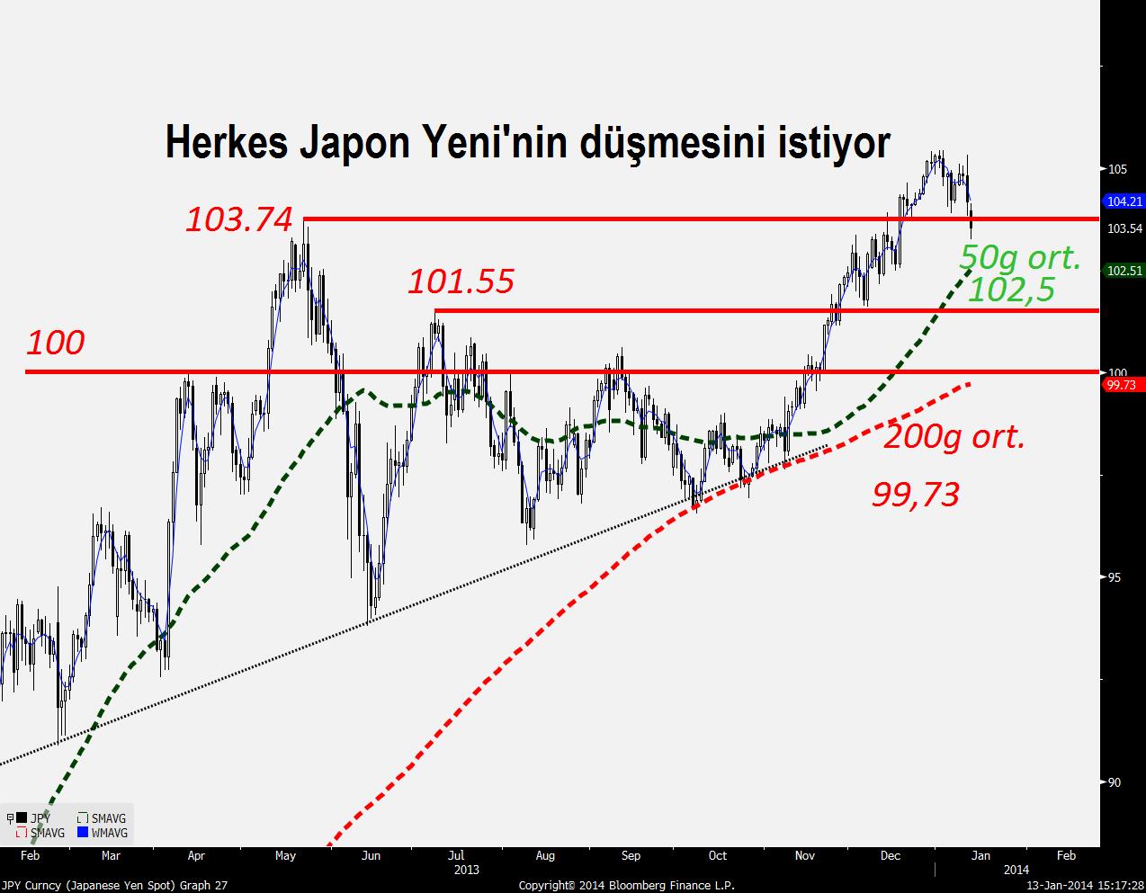 Japonya'da bugün piyasalar kapalıydı ve likidite azlığında yen ralli yaptı. 105 üzerinden dönen Dolar/Yen kritik 103,7 seviyesini de aşağı geçerek 103,5 civarında trade ediyor. 102,50 seviyesi ise paritenin 50 günlük ortalamasına denk geliyor. Rakamlarda sıyırırsak, http://www.japantimes.co.jp/news/2014/01/12/business/new-round-of-stimulus-to-cushion-second-tax-hike-in-2015-amari/#.UtPliPtbxUp linkindeki haberin de etkili olduğu görülüyor.