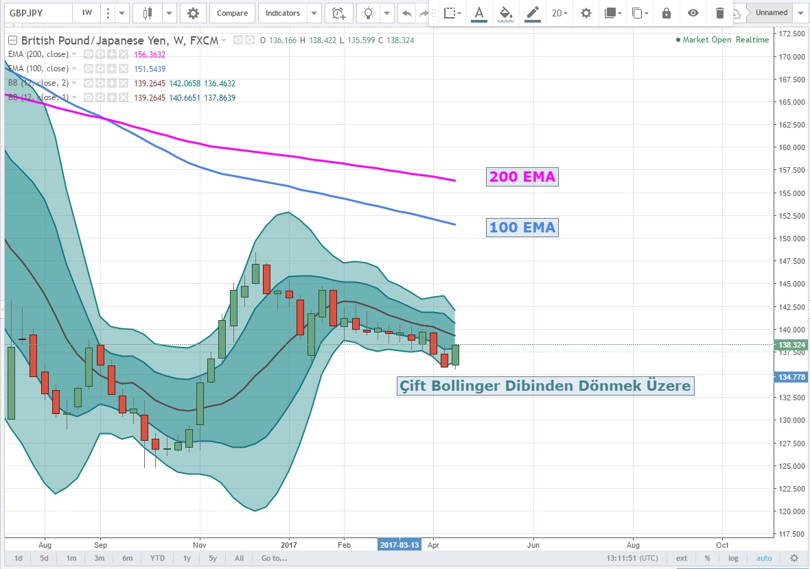 Haftalık grafiklerde çift bollinger dibinde olan paritenin buradan yukarı tepki vermesi olası