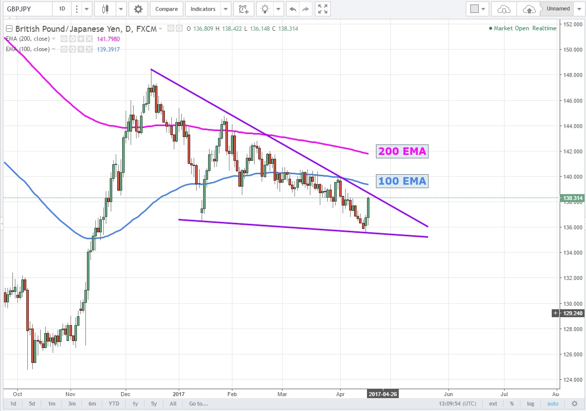 Düşen kama oluşturuyor izlenimi veren GBPJPY 'de 138.64 seviyesi kırıldığında formasyon tamamlanacaktır
