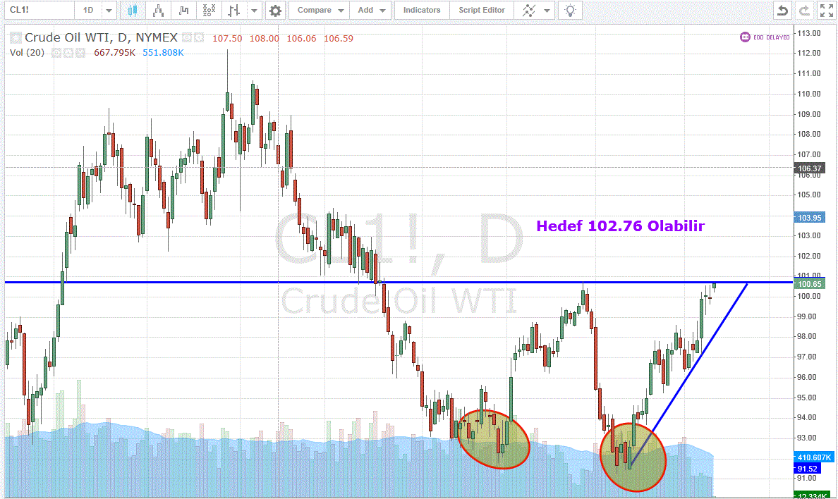Şu an kritik bir seviye olan $100.70 'i zorlayan WTI'da bu seviyenin yukarı geçilmesi teknik noktaları trade edenler için bir sinyal olacaktır. Bu yönde pozisyon almak isteyen yatırımcılar için hedef olarak $102.76 , stop loss seviyesi için ise $99.20 seviyeleri belirlenebilir.