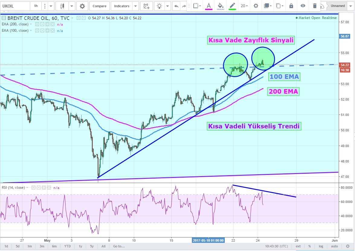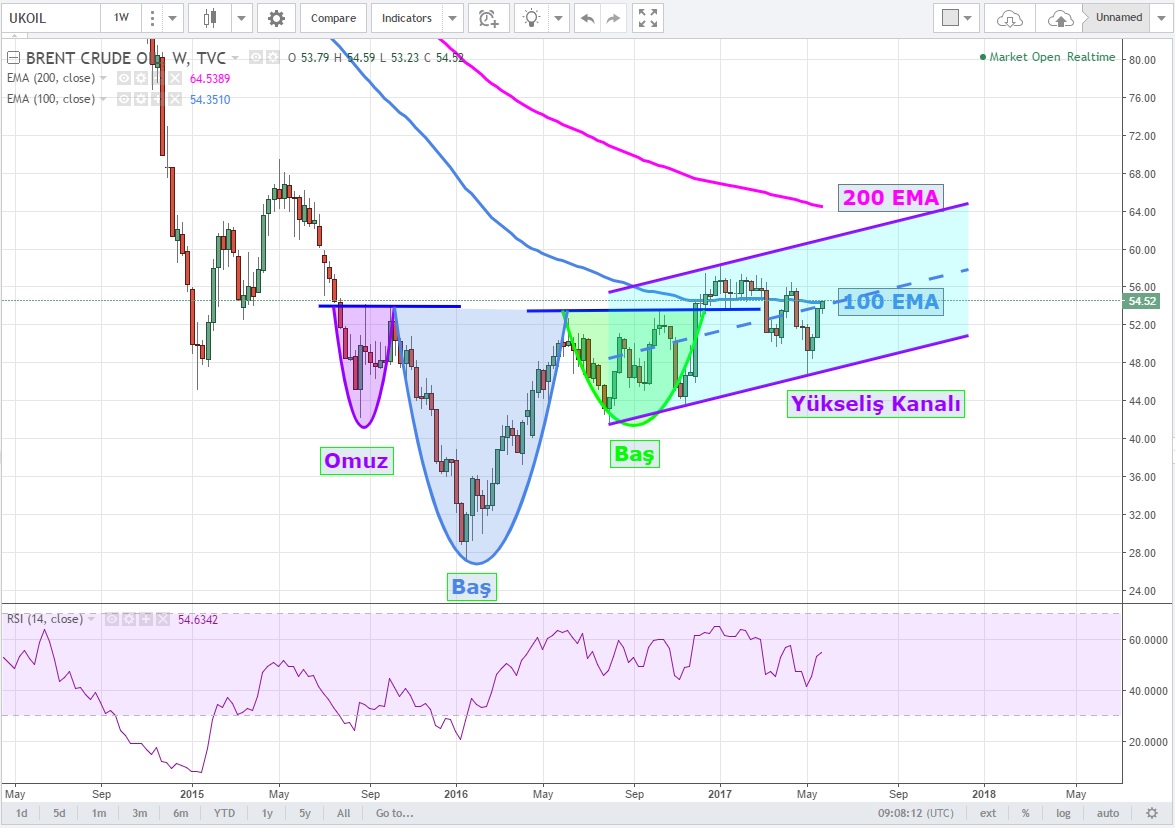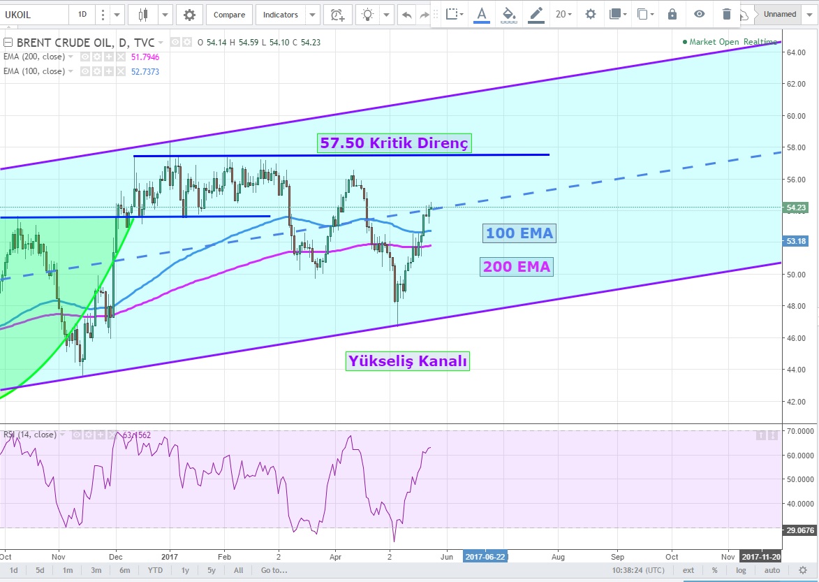 Daha önce konuştuğumuz TOBO 'yu tamamladıktan sonra ilk direncine ulaşan (57.50 USD) Brent, tekrar formasyonun direnç seviyesi olan 52.90 üzerine atmış durumda