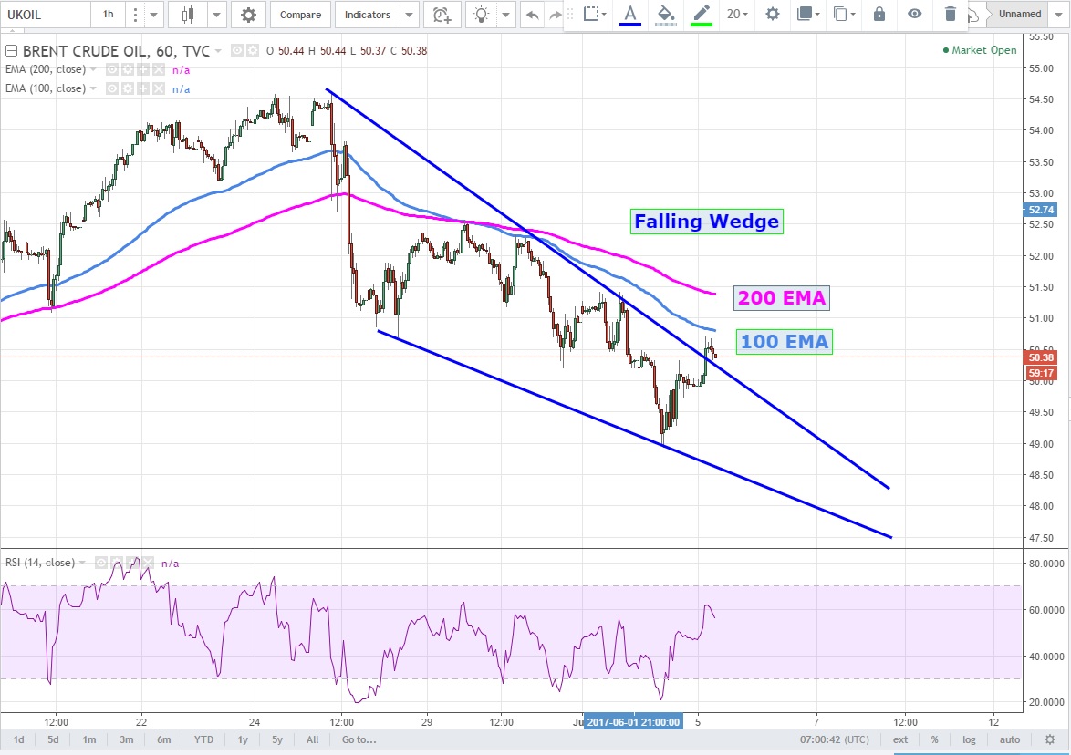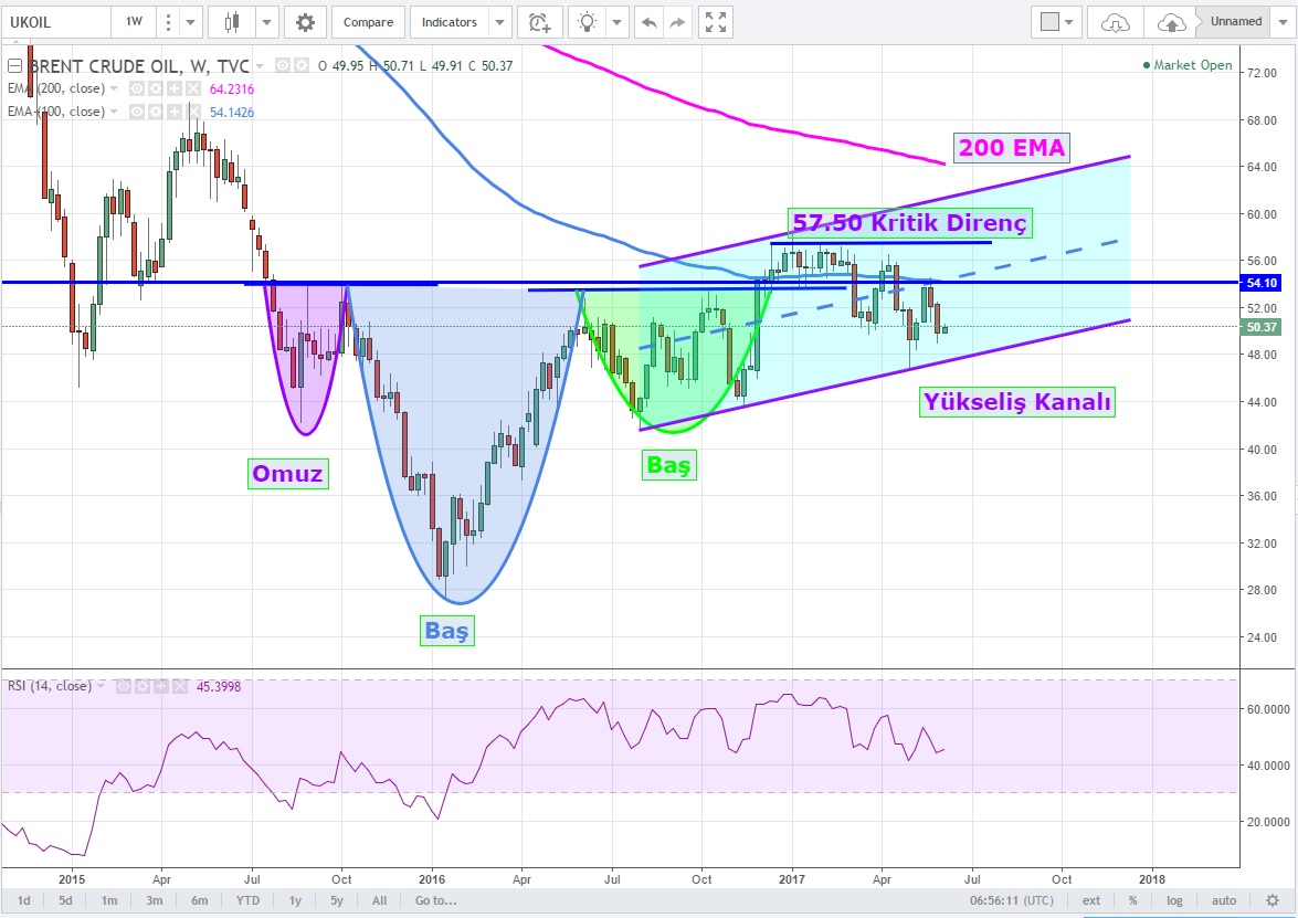 Düşen kama (falling wedge) oluşturan Brent Ağustos vadeli aktif kontratlarında 100 EMA ve 200 EMA direnç konumunda