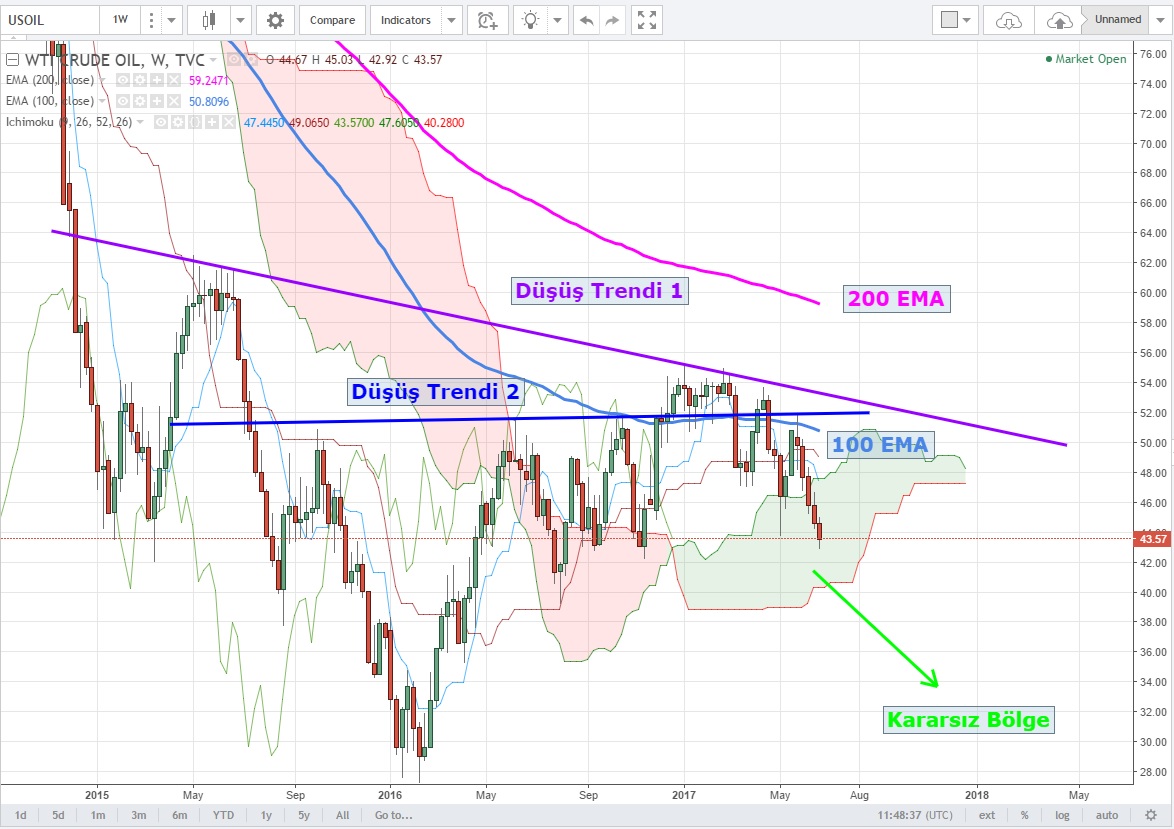 Haftalık grafiklerde 2 tane kuvvetli düşüş trendinde bulunan WTI Futures aktif vadelileri aynı zamanda bulut içerisinde kararsız bölgede salınımına devam ediyor