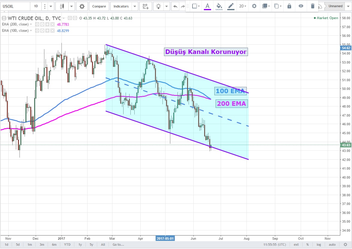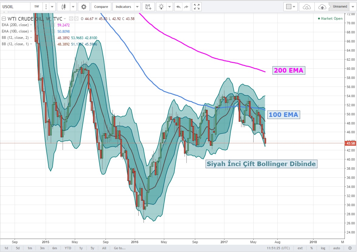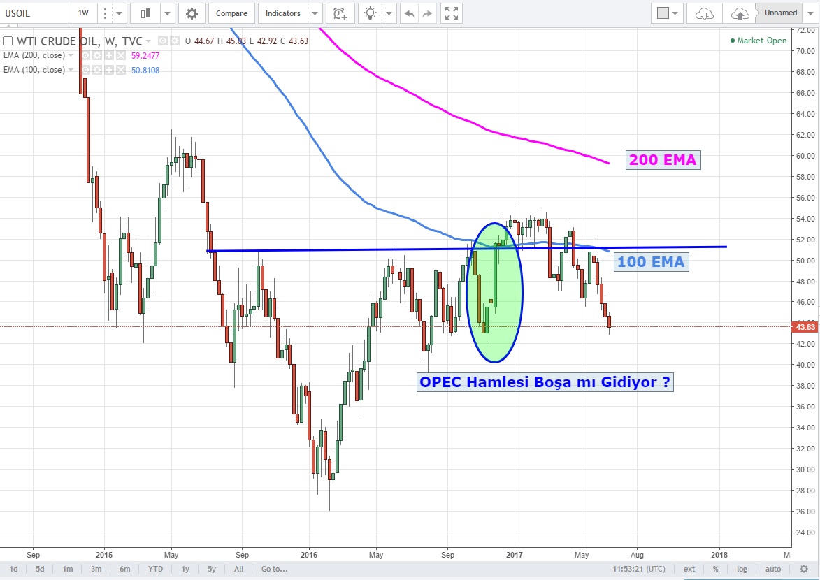 Daha dikkat çekici olan geçtiğimiz Kasım ayında yapılan OPEC anlaşması ile 44.85 - 51.80 hareketi yapan fiyatlar bu seviyenin altına sarkmış durumda