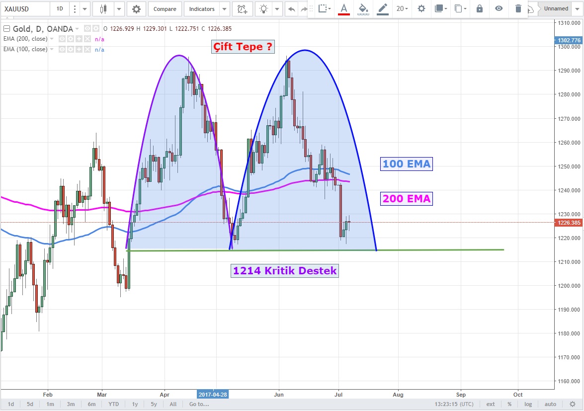 Günlük grafiklerde potansiyel çift tepe oluşturmaya çalışan değerli metalde ayılar 1214 altı günlük kapanış yapabilirse