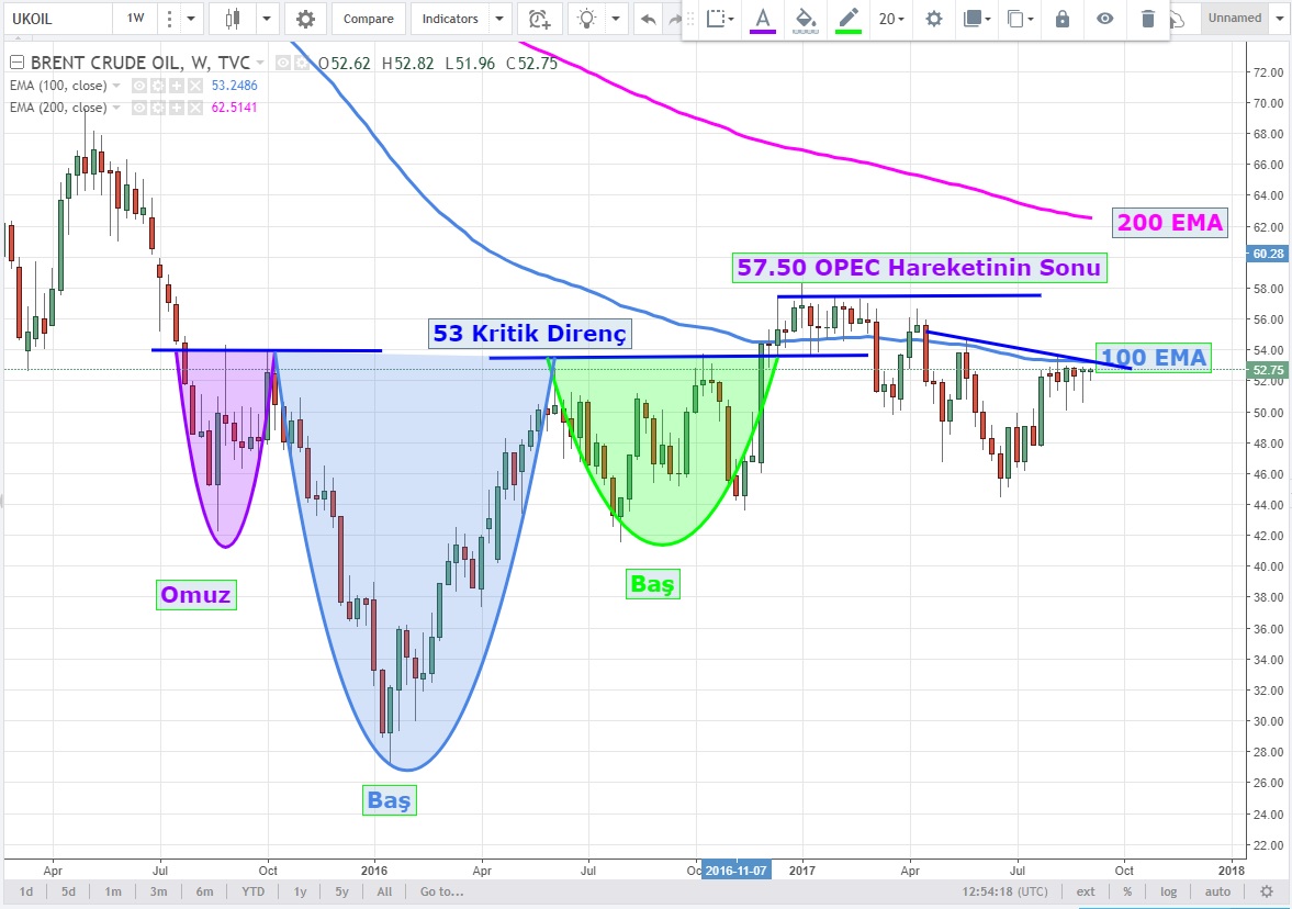 OPEC ile tetiklenen ve ilk hedef olan 57.50 'yi vurduktan sonra TOBO desteği altında seyreden siyah inci için 53 USD seviyesi kritik