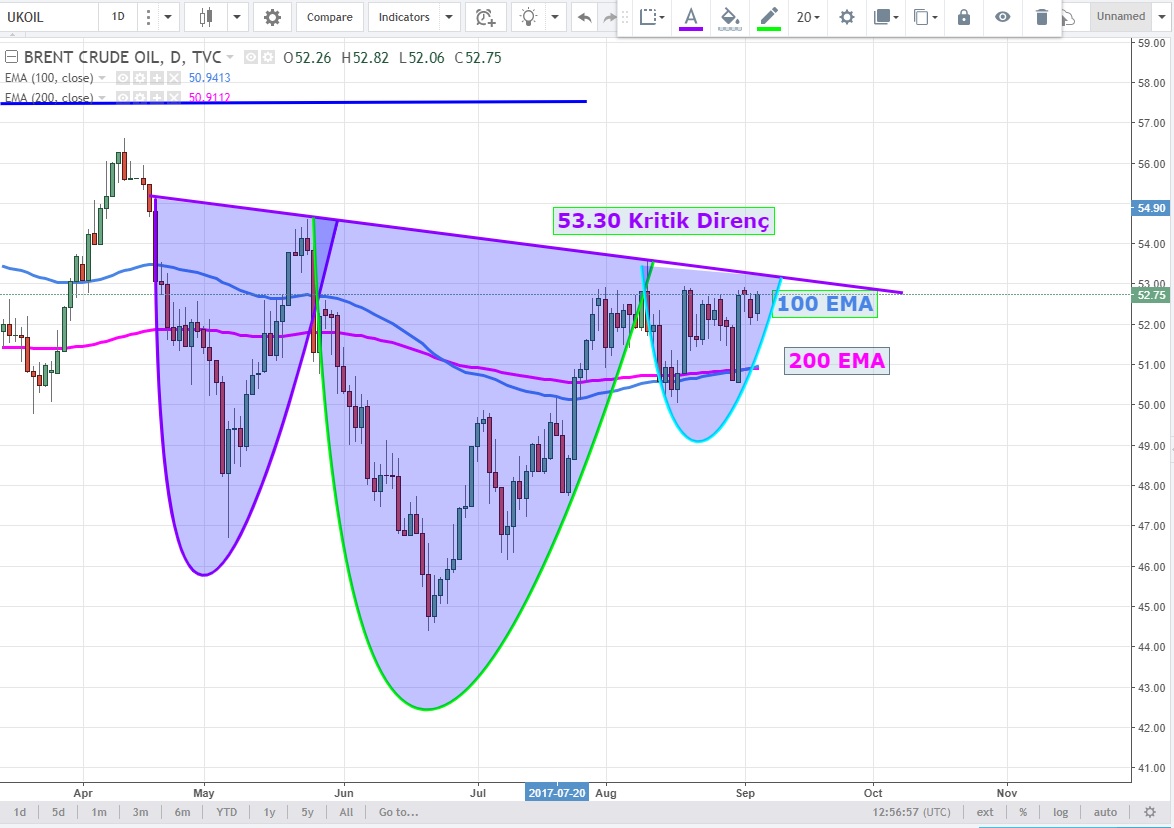 Günlük grafikelrde ise yeni bir TOBO oluşturan Brent Futures aktif vade kontratları için 53.30 USD seviyesi kritik