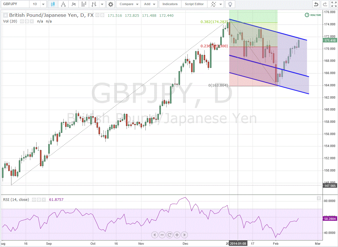 Teknik olarak baktığımızda 02.01.2014 tarihinden başlayan düşüş kanalından henüz çıkamasa da görünüm düzelmeye başlamış görülüyor. Yükselişin kalıcı olması için 172.20 seviyesinin yukarı yönlü kırılması gereken GBPJPY paritesinde bugün 11:30'da açıklanacak yıllık CPI verisi tetikleyici olabilir ve katalizör etkisi yaratabilir.