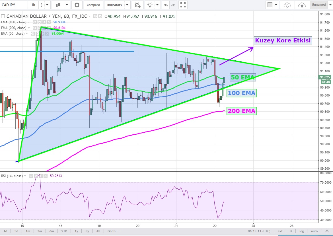 CADJPY Futures kontratlarına baktığımızda ise kısa vadeli üçgeni aşağı kırmayı denedikten sonra tekrar üçgen içerisine giren parite 91.30 üzerine atarsa kısa vadede gücünü geri kazanacaktır