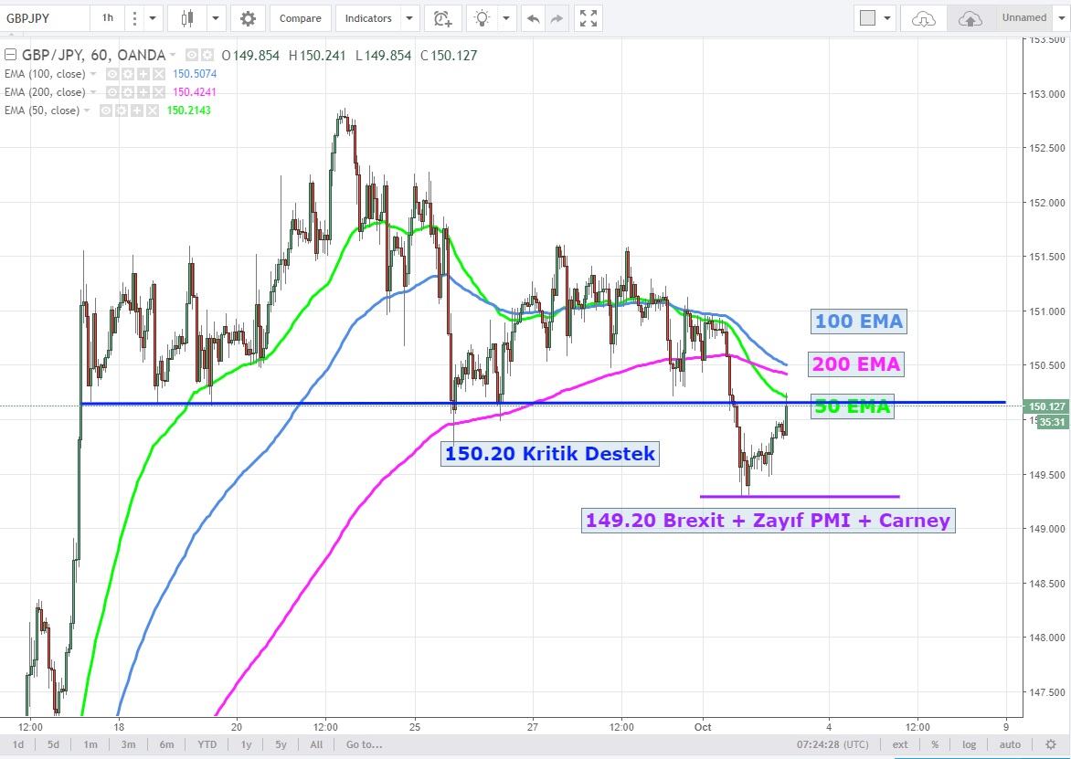 Saatlik grafiklere baktığımızda oluşan omuz baş omuz satışının 149.20 seviyelerinde son bulduğunu görüyoruz