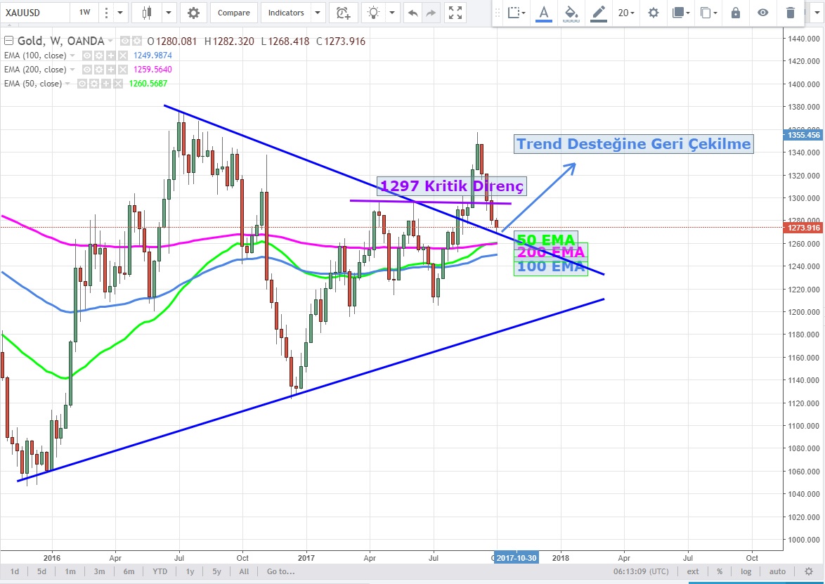 Haftalık grafiklerde kırdığı devasa üçgen desteğine geri dönen fiyatların aynı zamanda kritik 1297 USD desteği altına sarkması önemli