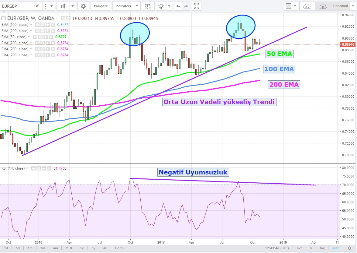 EURGBP aktif vadeli Futures kontratlarda haftalık grafiklerde ki yükseliş trendi kırıldığında şu an 0.8830 düşüşün başlamasını