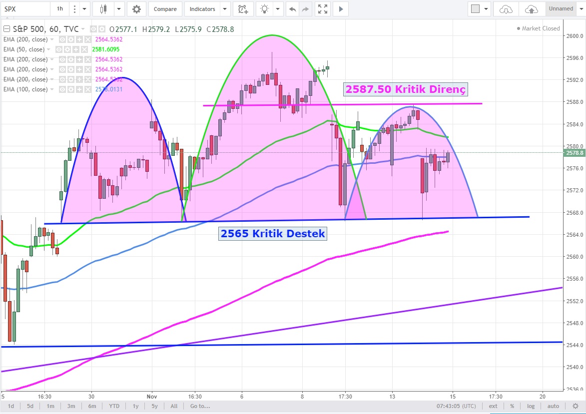 SP 500 Futures aktif vadeli kontratlarda hem orta vadeli yorulma hem de kısa vadede oluşan formasyon 2565 'in kırılması ile birlikte bir düşüşe işaret ediyor