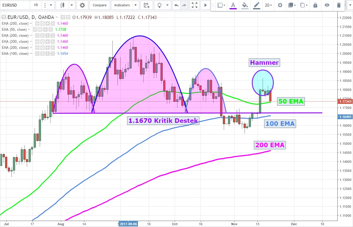 Yine günlük grafiklerde 1.1880 direncine yaklaşınca oluşan Hammer (Gravestone Doji 'ye de benziyor) dikkat çekici