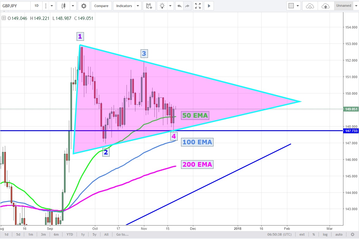 100 EMA 'ya dayanan paritede 147.70 üzeri kapanışlar henüz yukarı yönlü ivlemenmeyi başaramasa da yükselen üçgeni korumaya devam ediyor