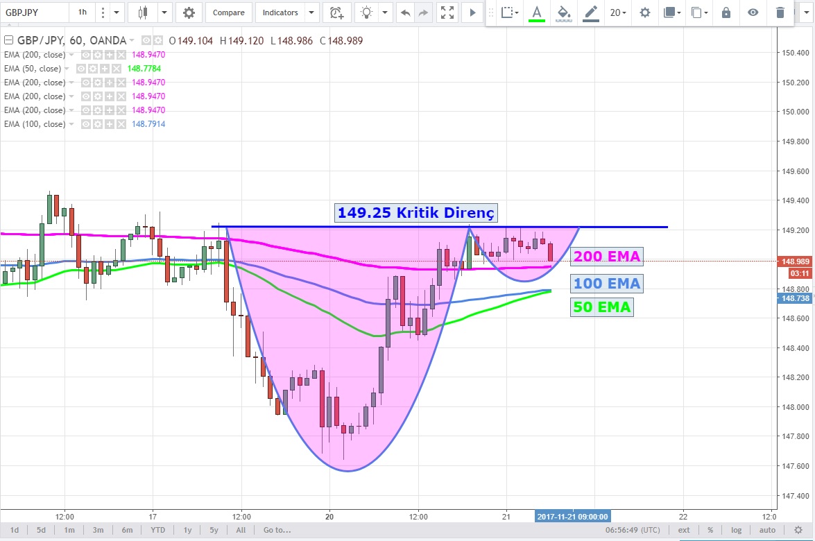Daha kısa vadeye indiğimizde ise fincan kulp oluşturmaya başlayan parite 149.25 direncini yukarı kırdığında formasyon devreye girecektir