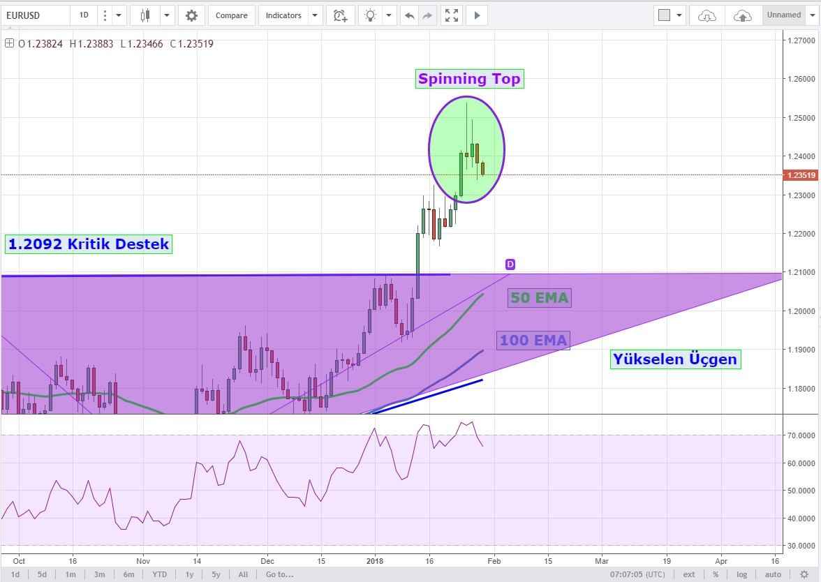 Ancak yine günlük grafiklerde oluşan spiğnnig top mum formasyonu dikkat çekici ve Euro 'nun USD karşısında 1.2540 seviyesini kırması için yeni bir katalizöre ihtiyacı olduğuna işaret ediyor
