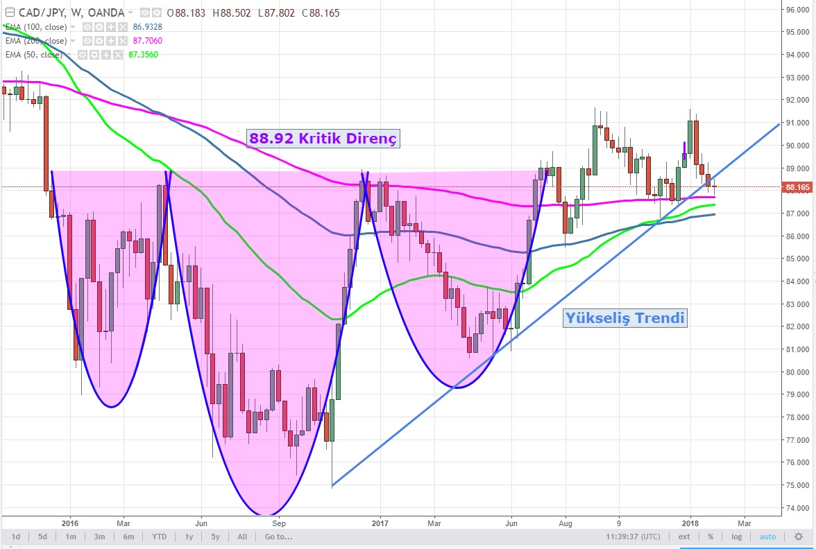 Haftalık grafiklerde daha önce de konuştuğumuz uzun vadeli TOBO formasyonunu uzatmaya devam eden parite 88.92 seviyesini geçtiğinde formasyon çalışmaya başlayacak