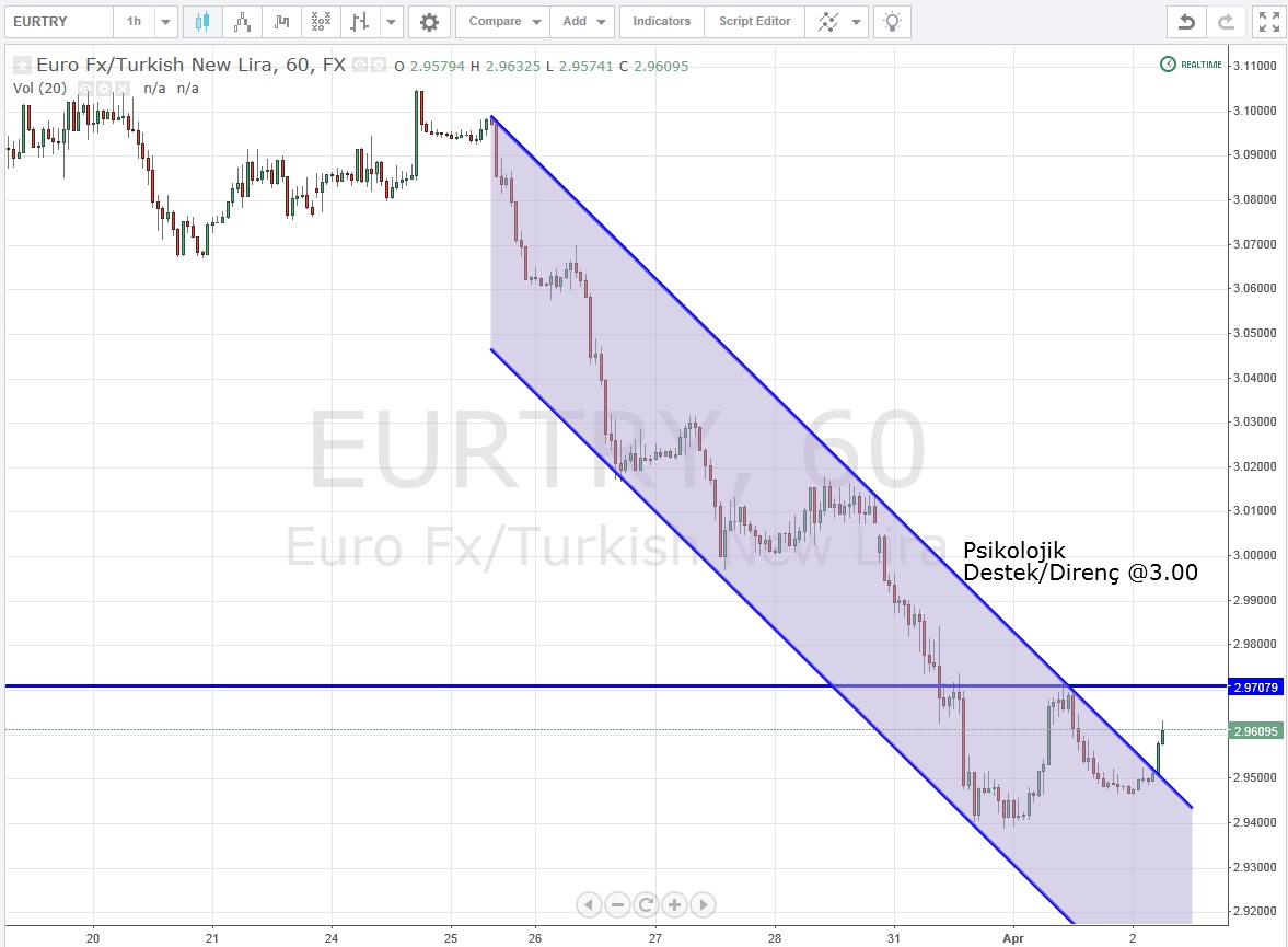 Buna göre 2,9450 seviyesi üzerinde kalındıkça psikolojik destek/direnç olarak su ana kadar iyi çalışan 3.00 seviyelerine kadar bir yükseliş görülebilir.