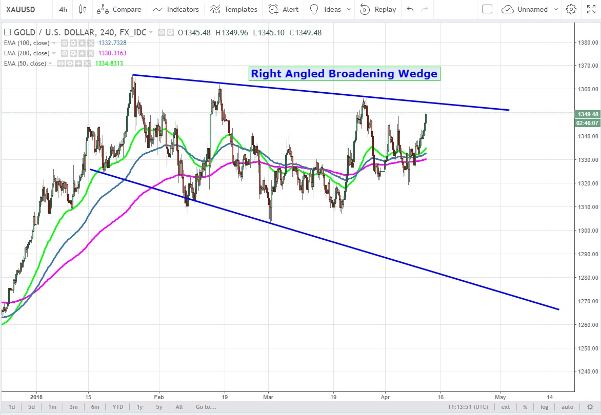 Daha kısa vadede Right Angled Broadening Wedge oluşturan Gold Haziran Futures kontratlarda 1354 USD 'nin aşılması ile beraber
