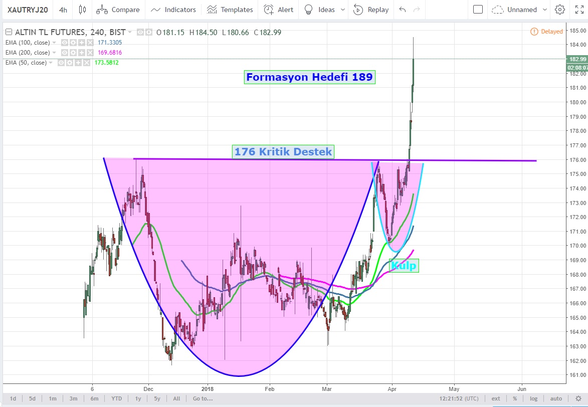 Kısa vadede fincan kulp oluşturan sarı metalin 176 üzeri kapanışlarda formasyon hedefi 189