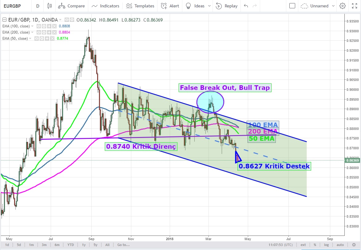 Teknik olarak düşüş kanalının dinibe doğru hareketini sürdüren parite için hareketli ortalamalar ve 0.8740 direnci geçilmediği sürece güç kaybının devamını bekliyorum