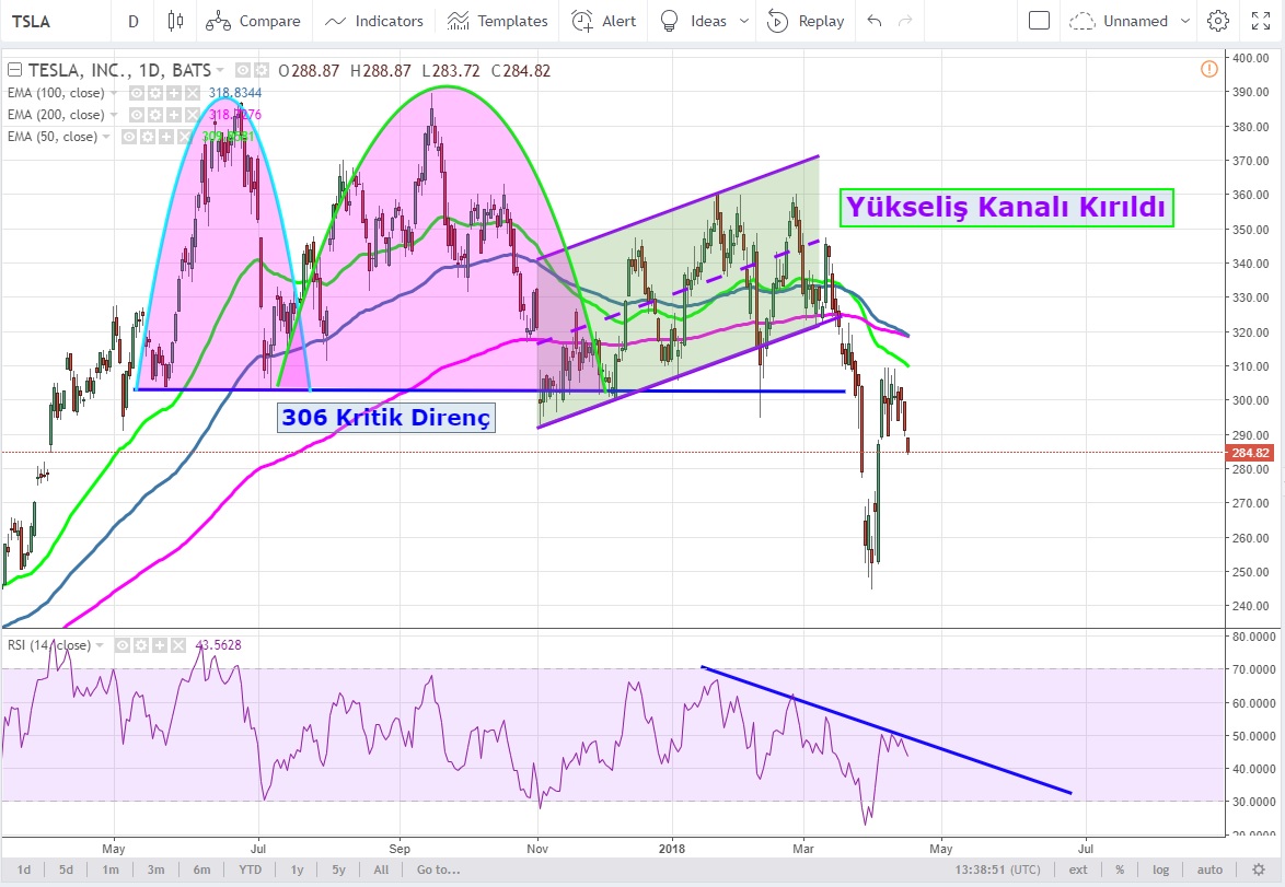 Günlük grafiklerde kritik 306 USD direnci üzerinde kuvvetli bir kalıcı yapamayan hisse senedi daha önce yükseliş kanalından da hızla uzaklaşıyor