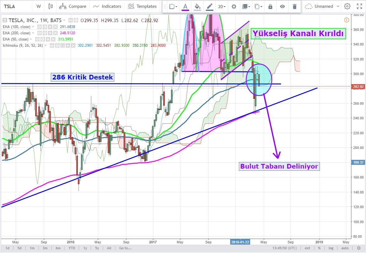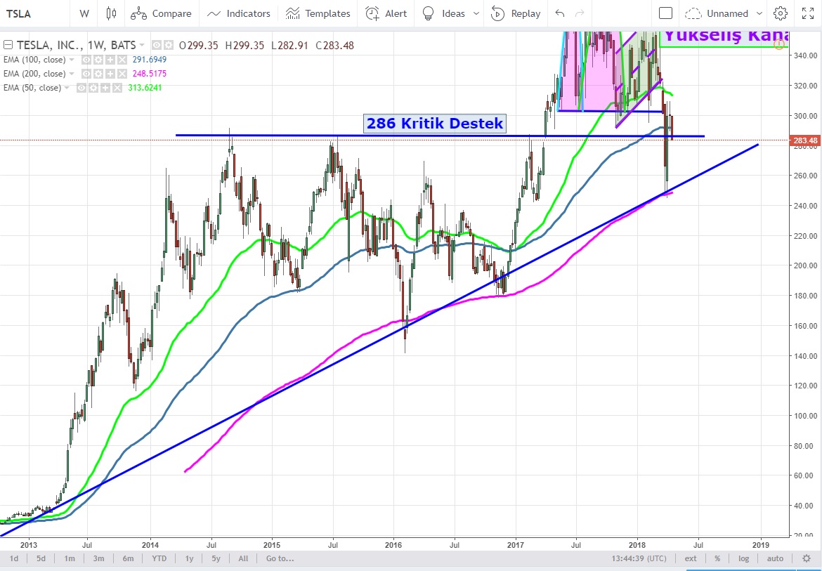 Haftalık grafiklerde daha önce de konuştuğumuz 286 USD desteği test ediliyor. Bu seviye altında haftalık kapanış Elon Mask için tünelin ucundaki ışığın daha da zayıflamasına neden olabilir