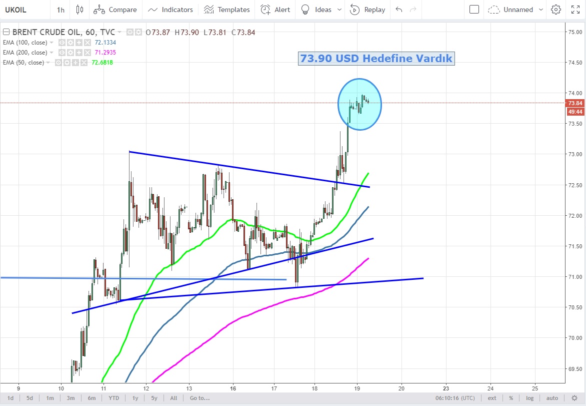 Brent Futures aktif vadeli kontratları için konuştuğumuz ilk hedef olan 73.90 USD seviyesine vardık