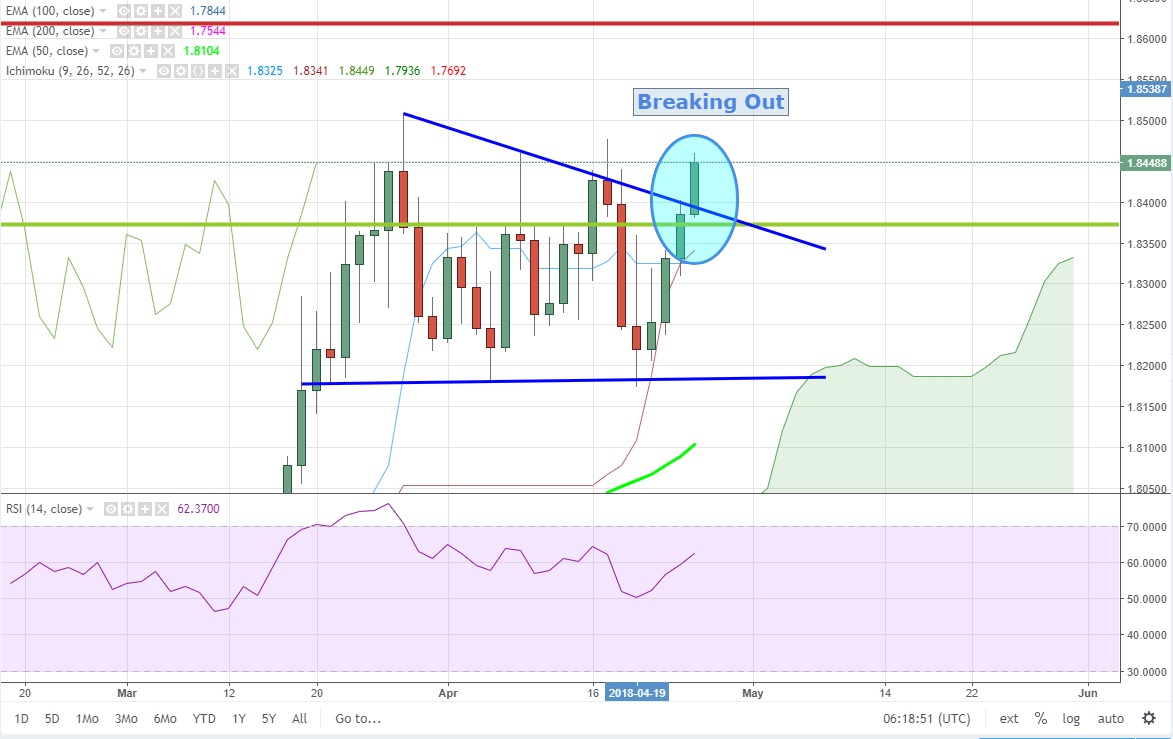 Günlük grafiklerde daralan üçgeni kırmaya hazırlanan (kapanışın 1.8390 üzerinde gerçekleşmesi gerek) paritede kısa vadede
