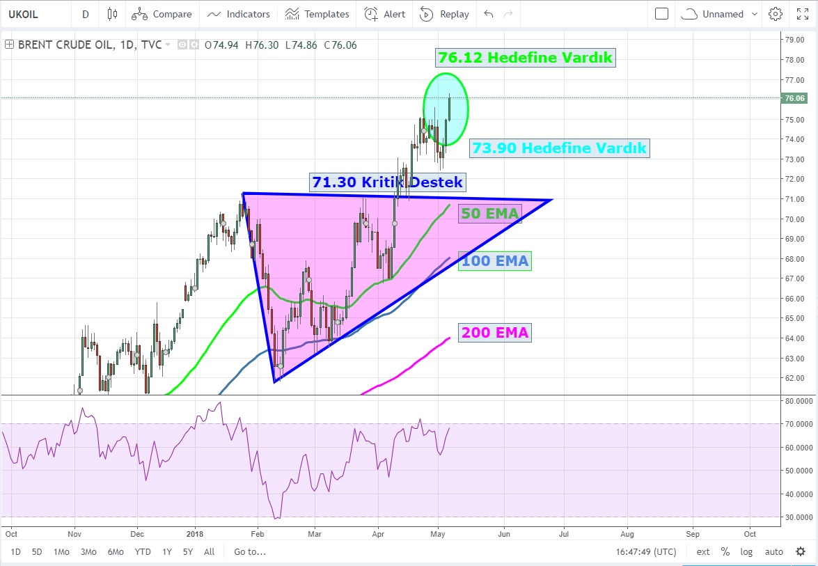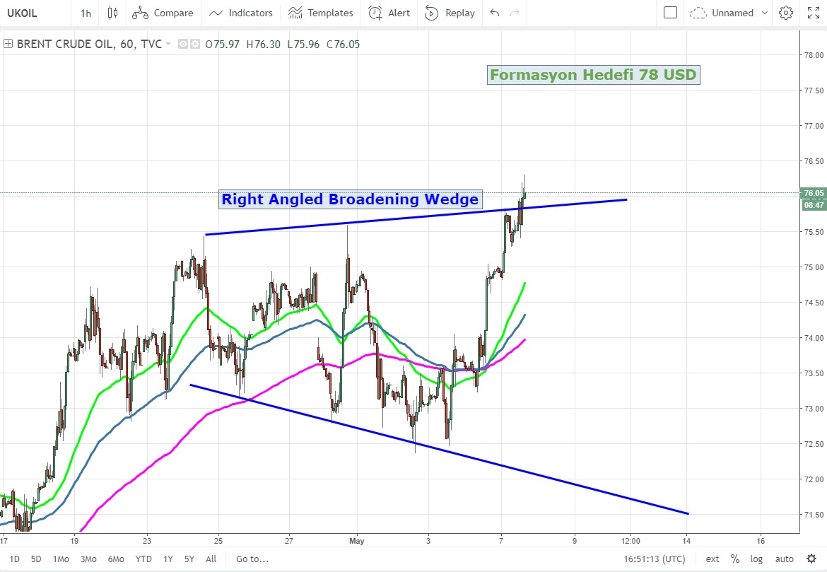 Kısa vadede Right Angled Broadening Wedge oluşturan Brent petrolde kritik destek 75.20 USD 'de. bu seviye üzerinde kapanışlar olduğu sürece 78 USD seviyesinin test edilomesini beklerim
