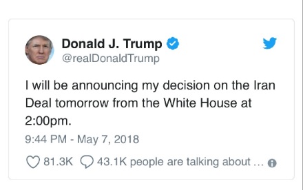 ABD başkanı Donald Trump, tweeter üzerinden İran nükleer anlaşması ile ilgili kararını bugün TSİ 21:00 'de açıklayacağını belirtti