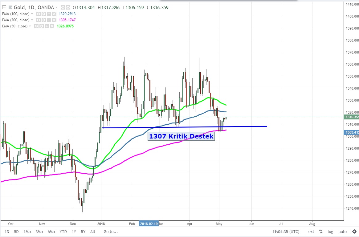Günlük grafiklerde 1307 kritik desteğini tutan sarı metalin yatay sıkışma alanında hareketine devam ettiğini görüyoruz