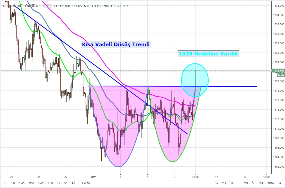 Gold futures aktif vadeli kontratları için konuştuğumuz ilk hedef olan 1323 USD seviyesine vardık (Tamam 1322.64 :) )