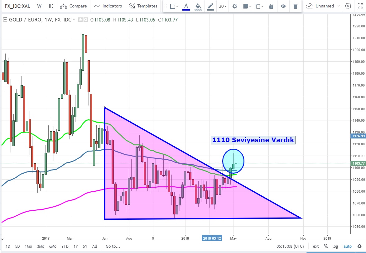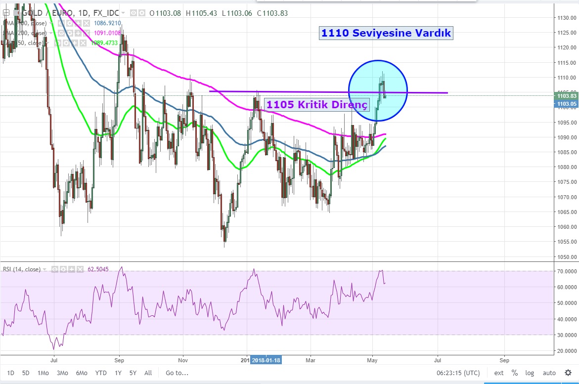 Haftalık grafiklerde hareketli ortalamaları destek olarak altına alan altının, Euro karşısında hareketine devam etmesi için 1105 üzeri günlük kapanışlara ihtiyacı var